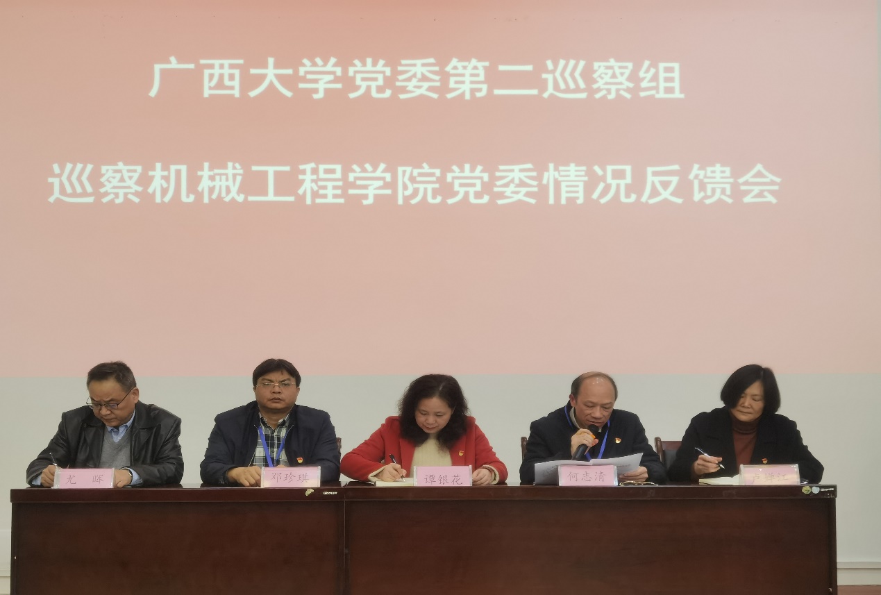 2022年1月4日下午,太阳成集团tyc122cc党委第二巡察组巡察太阳成集团党委情况反馈会在机械楼机二阶会议室举行,出席会议的有校党委巡察工作领导小组成员代表、审计处处长谭银花同志,校党委第二巡察组长何志清同志,校党委第二巡察组副组长、计算机与电子信息学院党委副书记、纪委书记邓珍琪同志,太阳成集团党委书记卢婵江同志,太阳成集团院长尤晖同志。参加大会的有太阳成集团全体教师和部分学生党员代表。大会由太阳成集团纪委书记黄路明主持,大会共进行了三项议程。