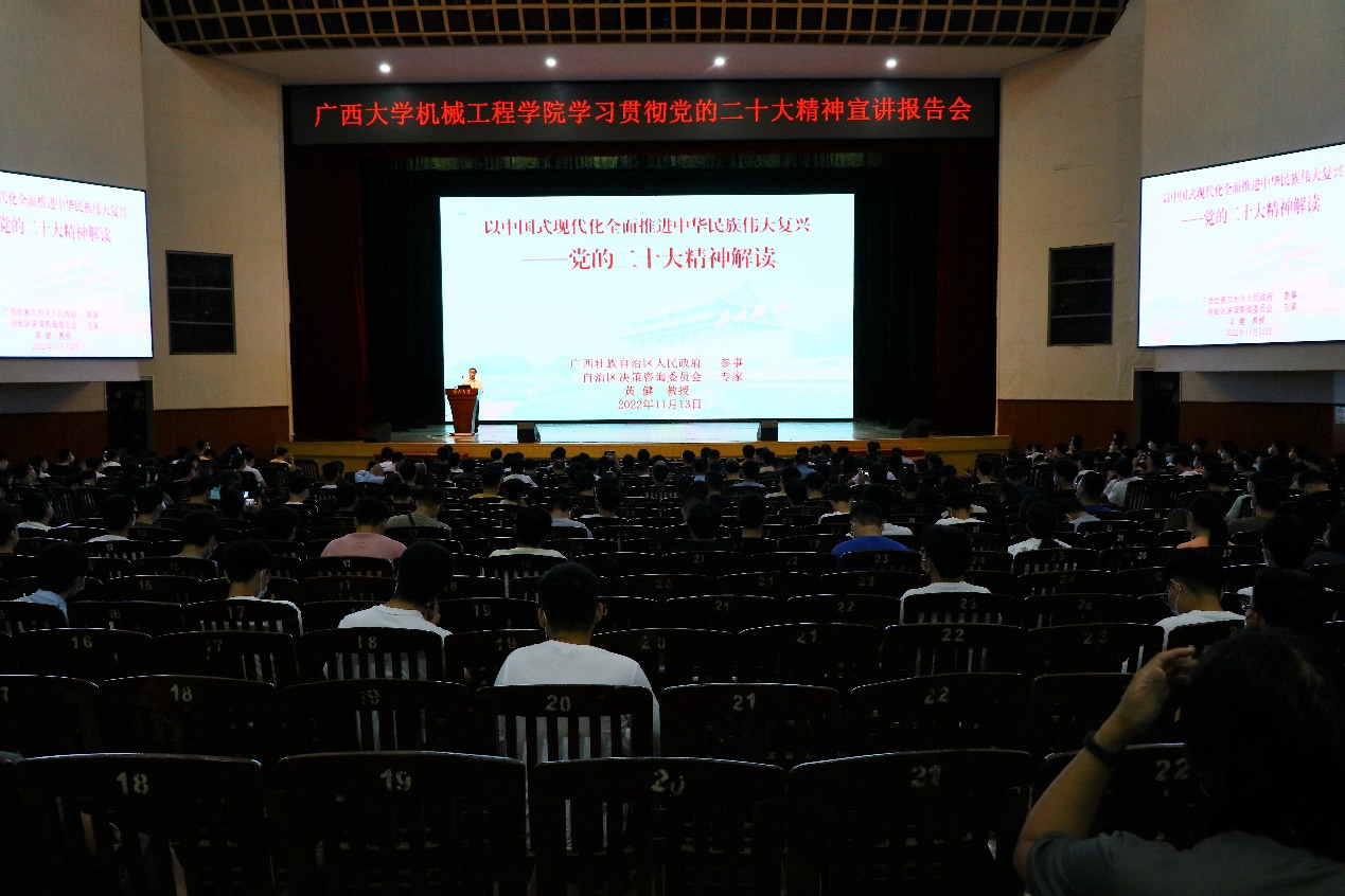为引导全院师生深入学习贯彻党的二十大精神,11月13日晚,学院党委在太阳成集团tyc122cc大礼堂召开学习贯彻党的二十大精神宣讲报告会。报告会邀请广西壮族自治区人民政府参事、自治区决策咨询委员会专家黄健教授作题为《以中国式现代化全面推进中华民族伟大复兴——党的二十大精神解读》的宣讲。全院师生党员及发展对象共四百多人参加报告会。院党委副书记黄路明主持报告会。