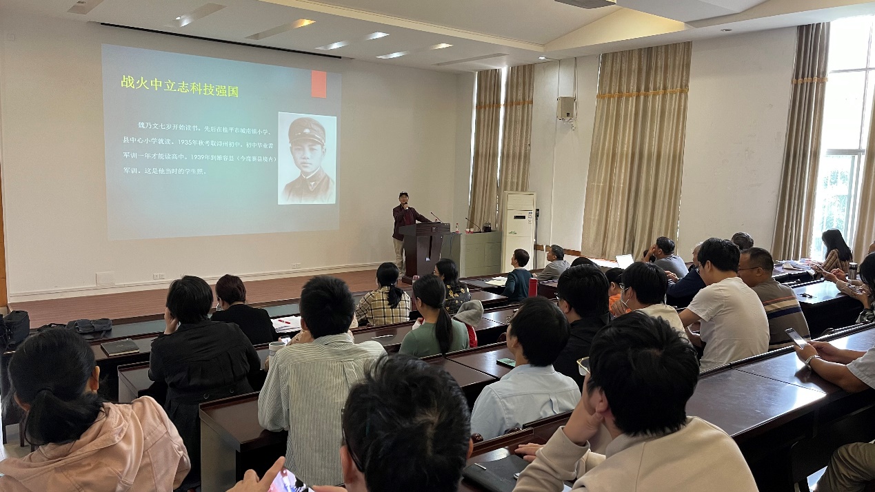 2022年11月15日下午,学院召开了全院教职工课程思政教育大会暨清廉故事会。此次特别邀请我院杰出校友、国家“两弹一星”研究专家魏乃文老先生的侄子——魏风先生,为全院教师职工上了一堂以追忆魏乃文老先生生平事迹、学习魏老家国情怀为主题的思政教育课。