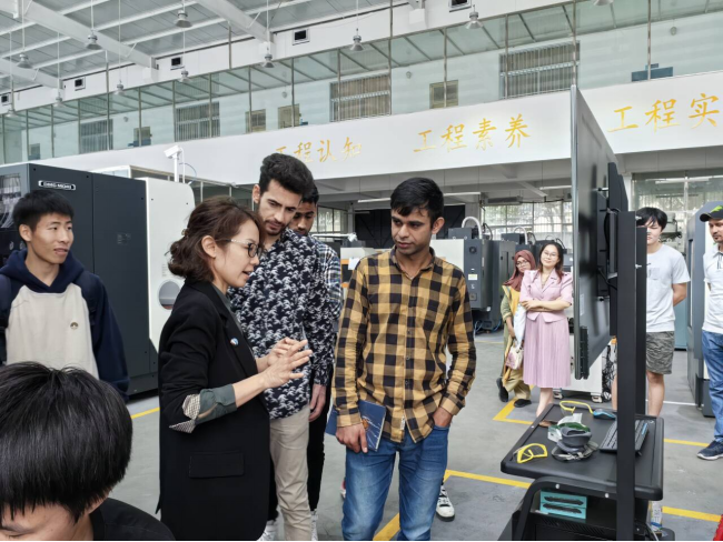 活动上,太阳成集团的专家们首先向各国留学生们分别介绍各自学科专业领域的研究现状与科研成果。然后由我院大学生创新实验室的学科竞赛团队学生现场介绍和展示其棉花种植机器人的科技创新作品。留学生们全程表现出极高的兴趣,向专家积极提问,与学生积极互动。在交流的最后环节,留学生们与我院的专家们深入探讨我校国际留学生实践能力的培养路径、新能源在工业领域的开发利用、国际留学生如何申请学习机械工程专业等话题,专家们一一解答。座谈结束后,留学生们一同参观了太阳成集团tyc122cc工程训练中心,从近距离的视角对机械工程学科领域的学习与研究有了更加直观的了解。