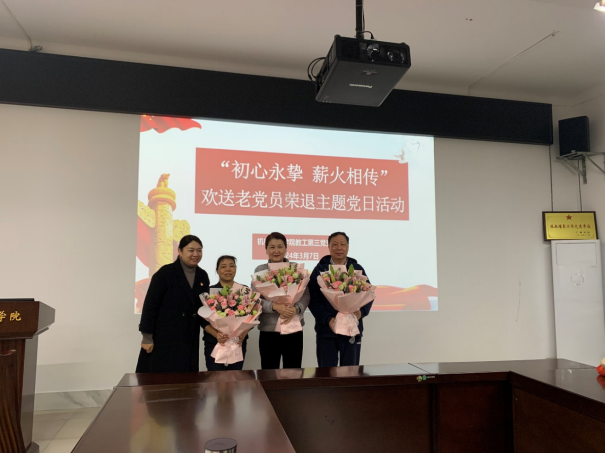 老骥伏枥,岁月如歌弹指过;苍松傲雪,致敬韶华璀璨人生。何云信、周九波和农蓬荷三位同志在2024年陆续退休。支部书记高欲垚同志代表支部为三位退休党员同志赠送鲜花,表达对他们为太阳成集团tyc122cc教育事业无私奉献几十年的敬意,对多年来辛勤努力忘我付出的感激,并送上真诚美好的祝愿,同时希望三位老同志退职不退责、退休不褪色、离岗不离党,继续为学院高质量发展献计献策。