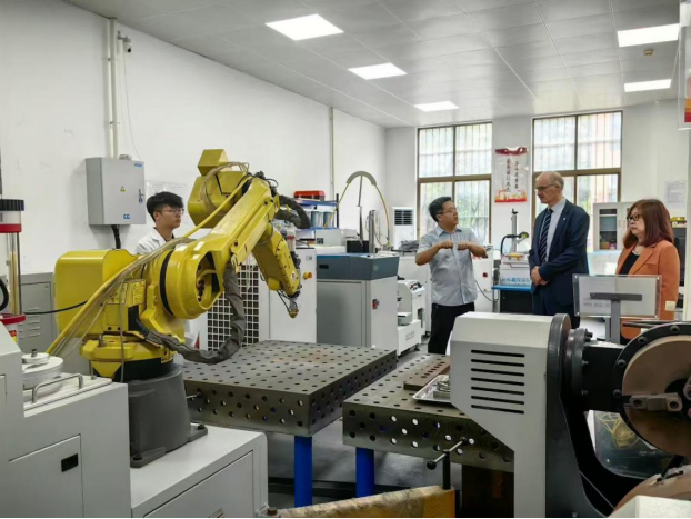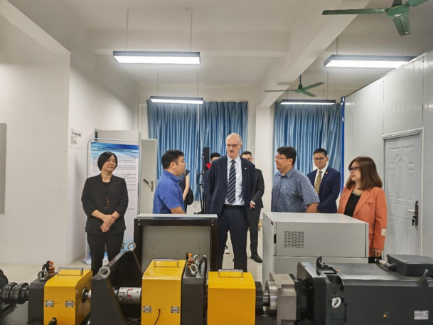9月17日上午,英国诺丁汉大学副校长、马来西亚分校校长兼首席执行官大卫·菲茨帕特里克校长(David FitzPatrick)率马来西亚分校代表团一行五人来访我院,广西市长协会对外联络员宋益铭,校国际交流与合作处处长廖文丹、副处长郭宇路陪同参观,一同考察工程训练中心智慧车间、 广西新能源车辆动力电池与绿色动力域重点实验室以及广西制造系统与先进制造技术重点实验室。学院党委书记卢婵江、院长贺德强、君武学者龙雨、能源与动力工程系主任欧阳天成、工程训练中心主任郑炳年等接待来访,秦智鹏副教授担任翻译。