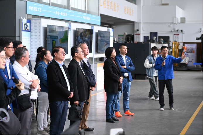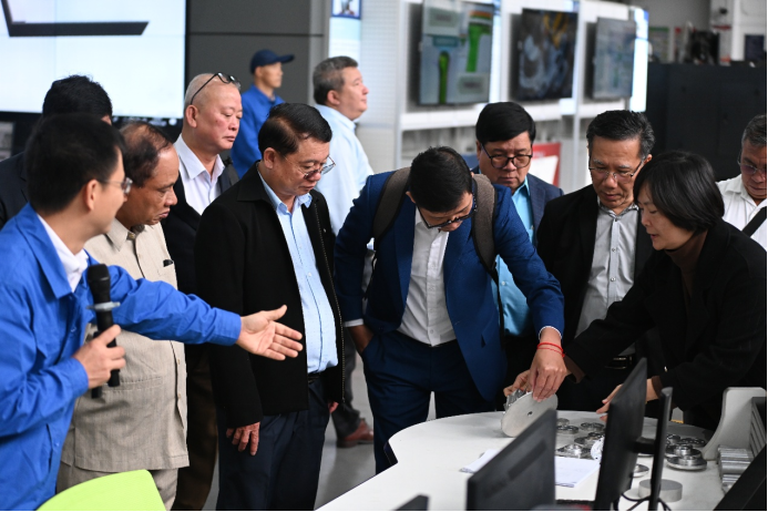 柬埔寨教育代表团走进太阳成集团tyc122cc智慧车间,全面了解工程训练中心基于工程训练所开展的教学、科研、高技能人才培训以及科普教育等概况,观看智慧车间的数字化信息管理系统、柔性生产线、五轴数控加工、智能分拣等完整智能生产流程。各位来宾对智慧车间的设施配置和教学应用表现出浓厚兴趣,频频驻足,就设备运行、零件生产等问题与我院教师进行交流,对太阳成集团tyc122cc在人工智能领域的建设成效给予高度评价。