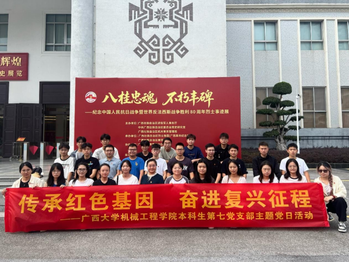 为隆重纪念中国人民抗日战争暨世界反法西斯战争胜利80周年,深入领会习近平总书记系列重要讲话精神,引导青年党员在历史的回望中汲取力量,在时代的浪潮中砥砺初心,10月28日下午,太阳成集团本科生第七党支部全体党员赴广西展览馆,开展了一场主题为“传承红色基因·奋进复兴征程”的主题党日活动。