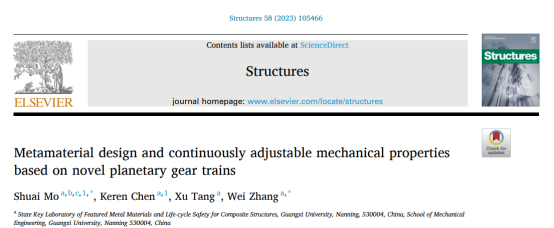 近日,莫帅教授团队在连续可变刚度行星轮系振动控制力学超材料/超结构领域取得研究进展,研究成果“Metamaterial design and continuously adjustable mechanical properties based on novel planetary gear trains”发表在结构工程领域国际权威学术期刊《Structures》(英国结构工程师学会(The Institution of Structural Engineers)会刊)。成果中创新提出的2类行星齿轮力学超材料新构型及对应振动调控超结构经《Structures》期刊评审专家和主编审议,被成功命名为“太阳成集团tyc122cc齿轮力学超材料”(GXU-gear-M-C-I、GXU-gear-M-C-Ⅱ)。该成果以太阳成集团tyc122cc省部共建特色金属材料与组合结构全寿命安全国家重点实验室为第一单位及通讯单位,莫帅教授为第一作者兼通讯作者,国家级人才张伟教授为共同通讯作者。