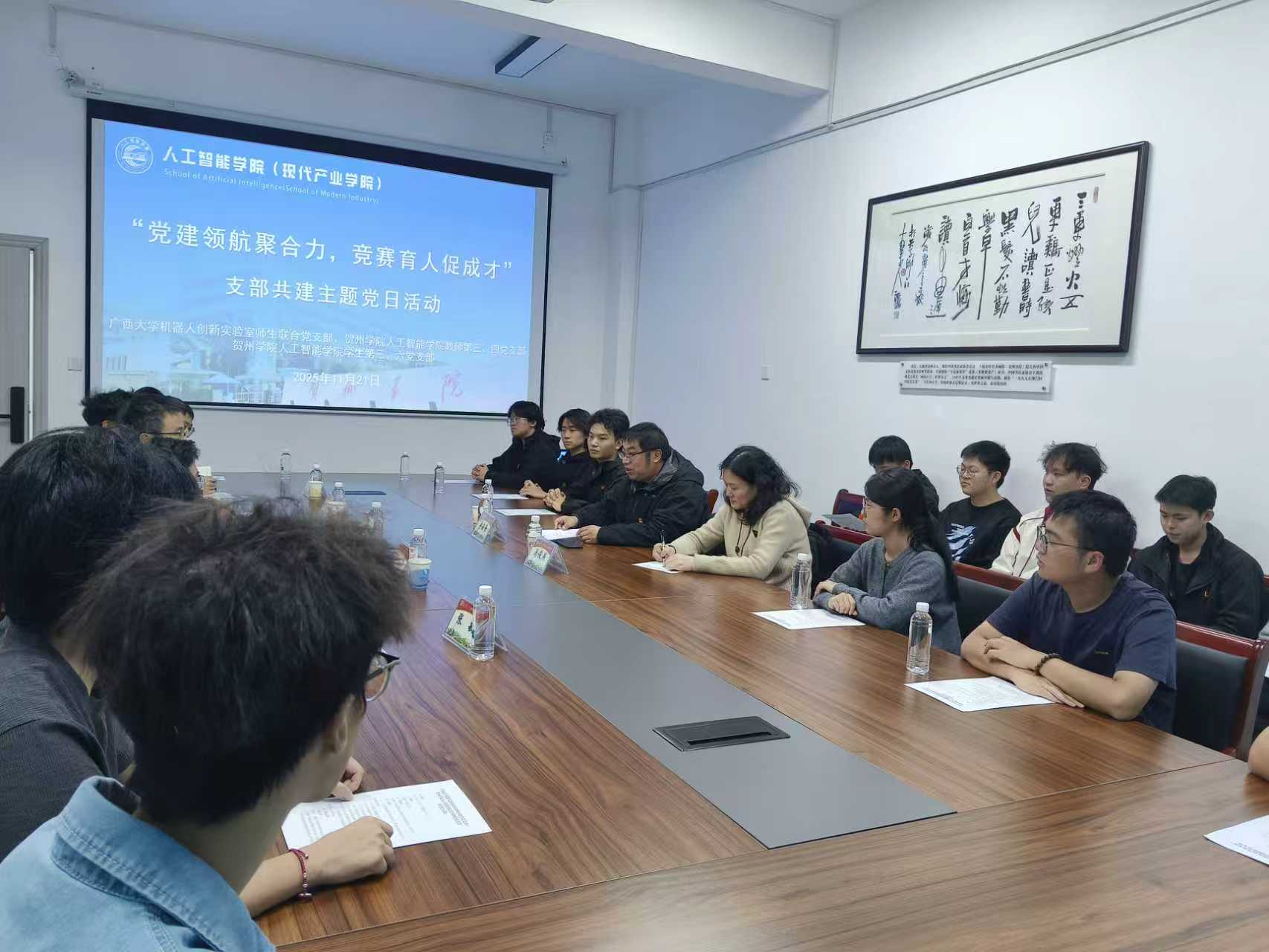 2025年11月21日下午,我院党委新成立的太阳成集团tyc122cc机器人创新实验室师生联合党支部在支部书记李岩舟老师的带领下,赴贺州学院与贺州学院人工智能学院教师第四党支部开展“党建引领实践育人,智能助力教育强国”联合主题党日活动。贺州学院人工智能学院(现代产业学院)党委书记李素云、党委副书记兼纪委书记邓玉赏、智能工程系主任罗士君以及两个支部的全体党员参加联建。