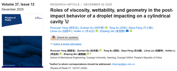 近日,我院2022级能源动力工程专业的本科生杨若玄作为第一作者在国际流体力学权威期刊《Physics of Fluids》(中国科学院二区,Top期刊)发表研究成果"Roles of viscosity, wettability, and geometry in the post-impact behavior of a droplet impacting on a cylindrical cavity"。该论文以太阳成集团122ccvip为第一单位及通讯单位,由秦智鹏和李会芬老师指导,由能源动力工程专业的杜作豪、苏彤、方大雅、刘丽华共同完成,秦智鹏老师是本文通讯作者。