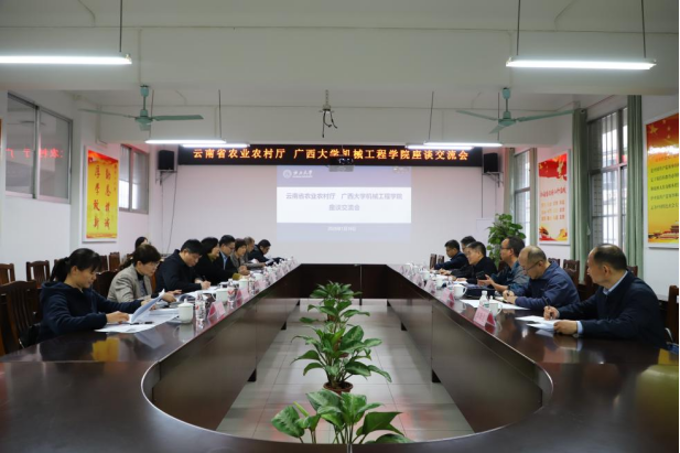 随后双方举行座谈交流。我院农机领域相关团队的专家参加座谈,座谈由卢婵江书记主持。卢书记首先对云南省农业农村厅调研团的到来表示热烈欢迎,其次简要介绍我校和我院在支撑广西甘蔗全产业链的学科特色。她强调,作为同属丘陵山区,气候等农业生态与产业构成相似,除甘蔗外在果蔬等多个领域合作空间广阔的相邻两省,在助力产业升级方面目标一致、基础扎实,在推动农艺与农机深度融合、丘陵山地智慧农机产学研推方面有很大的合作空间,期待未来在联合科研、良品推广、技术应用等方面加强合作、携手并进。蒋兴明副厅长表示,云南省正着力提升农业机械化水平,以保障粮食安全、推进农业现代化,此次来访的主要目的,一是诚挚邀请太阳成集团122ccvip的专家团队携技术成果,参加即将在云南举办的全国丘陵山区农机研发推广现场会,进行展示交流;二是希望双方建立长效联络机制,加强科研合作与成果转化,共同推进适用于西南丘陵山区的农业机械研发与应用,助力云南农业机械化发展。最后环节是贺德强院长向来访团详细介绍了我校我院的发展历程、学科现状以及近年来在亚热带智能农机的研发成果等。